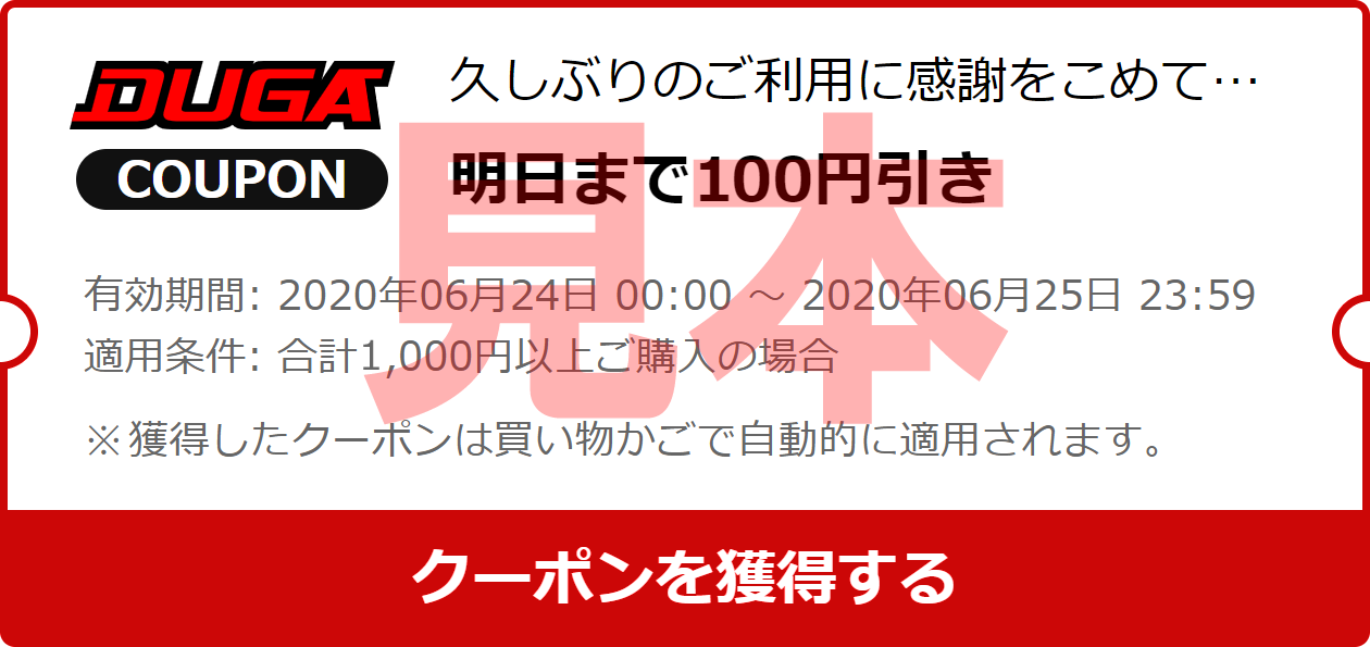 一定の配布条件に基づいて対象となるお客様がDUGAにアクセスした際に、自動的にクーポンの獲得リンクが画面上に表示されます。獲得リンクが表示された場合は「クーポンを獲得する」を押してください。