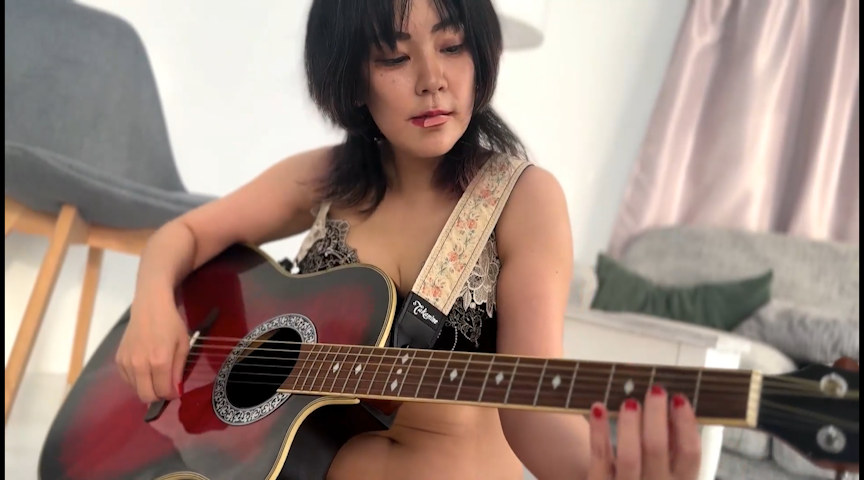 コスプレイヤーHちゃんの下着でギター練習。真剣にギターコードを抑える指先と、下着姿の無防備さが織りなすギャップ!集中する横顔が最高にエモい!