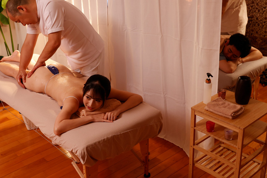 カップルで来店出来る数少ないマッサージ店。今日も3組の夫婦が来店。カーテン一枚挟んで並ぶご夫婦だが、旦那にバレないように奥様にきわどいマッサージを施す施術師。アロマオイルでテカテカになった恥骨と鼠蹊部を熟練の手つきで愛撫のようなマッサージ!!事故ったふりして割れ目と乳首に大胆にコンタクトするが、スイッチが入ってしまった奥様がビクンと夜のベッドの中のメスの様なナイス反応。それを察した施術師が、剛毛掻き分け陰核クリクリマッサージ!!セックスレスの奥様たちが久しぶりのクリイキの感触で捲れ上がる小陰唇!!挿入スタンバイOK!!子宮の奥まで他人棒インサート!!しっかりと中出しされ、エストロゲンの過剰分泌で女性ホルモンの活性化っ!!肌が艶やかツルッツルで退店!!