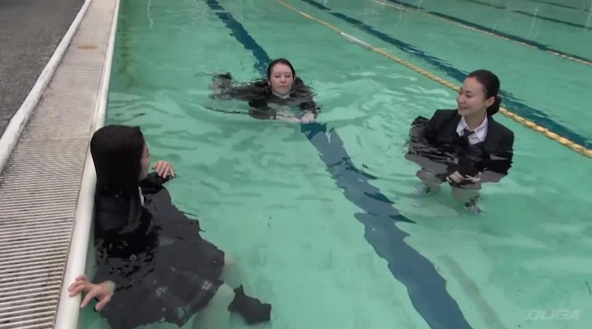 ブレザーやカーディガンも着用して泳ぎ難さ満載!!それでも頑張ってプールに潜ってみたり泳いでみたり、背泳ぎをしてみたり…色々と試していました。ペットボトルをビート版代わりにして泳ぐシーンも!