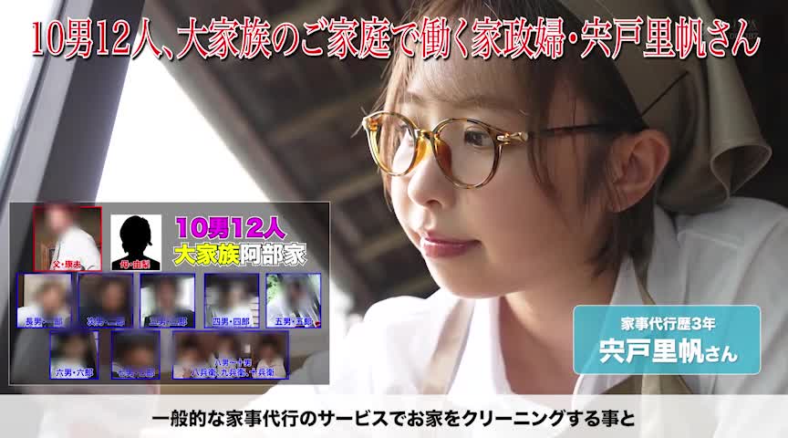 10男12人、大家族の家庭で働く家政婦・里帆さん(家事代行歴3年)こちらの会社モーイクは家事に加えて下半身ケアも行う、これまでにない代行サービス。「弊社のモットーはお家もチ●ポもピカピカに!炊事・掃除…身の回りの事は私が性交しながらご奉仕します」大家族の忙しい毎日を挿入しながらサポートし、性欲を笑顔で受け入れる里帆さん。「サイズ・勃ち・好きな責めも一人一人違うので、お客様にヒアリングしながら一番気持ち良い射精ができるように擦り合わせていくのが少し大変です」最高のおっぱい・お尻・笑顔・癒しをあなたに!お試しライトプラン編。